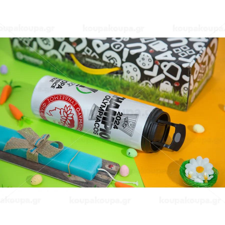 Olympiacos UEFA Europa Conference League Champion 2024, Πασχαλινή Λαμπάδα με Travel Tumbler θερμό με διπλό καπάκι (600ml, BPA free) & κερί αρωματικό πλακέ (30cm) (ΤΙΡΚΟΥΑΖ)