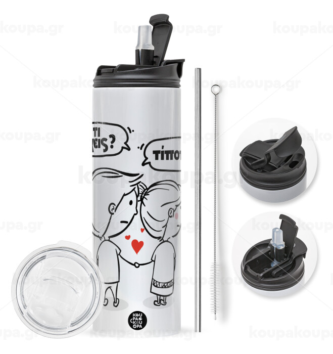 με 2 καπάκια για να επιλέξετε ανάμεσα σε απλό ποτήρι με καλαμάκι ή μετατροπή σε παγούρι θερμό με 2 τρόπους χρήσης (καλαμάκι ή στόμιο) με μεταλλικό επαναχρησιμοποιούμενο καλαμάκι. Απολαύστε το αγαπημένο σας ρόφημα κάθε στιγμή στο μοναδικό αυτό οικολογικό θερμό. Διατηρεί τη θερμοκρασία για αρκετές ώρες και είναι κατασκευασμένο από ανοξείδωτο ατσάλι. Κατάλληλο για ζεστά και κρύα ροφήματα. Συνοδεύεται από βουρτσάκι καθαρισμού για το καλαμάκι.