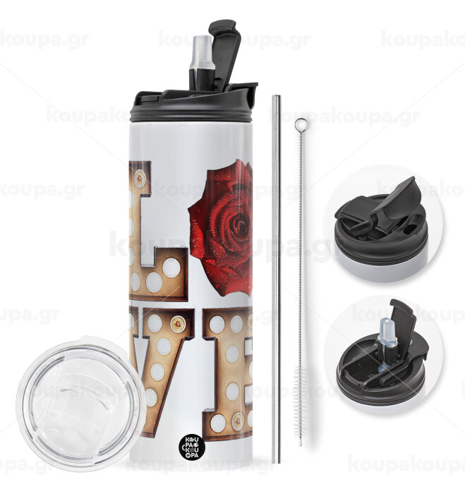 με 2 καπάκια για να επιλέξετε ανάμεσα σε απλό ποτήρι με καλαμάκι ή μετατροπή σε παγούρι θερμό με 2 τρόπους χρήσης (καλαμάκι ή στόμιο) με μεταλλικό επαναχρησιμοποιούμενο καλαμάκι. Απολαύστε το αγαπημένο σας ρόφημα κάθε στιγμή στο μοναδικό αυτό οικολογικό θερμό. Διατηρεί τη θερμοκρασία για αρκετές ώρες και είναι κατασκευασμένο από ανοξείδωτο ατσάλι. Κατάλληλο για ζεστά και κρύα ροφήματα. Συνοδεύεται από βουρτσάκι καθαρισμού για το καλαμάκι.