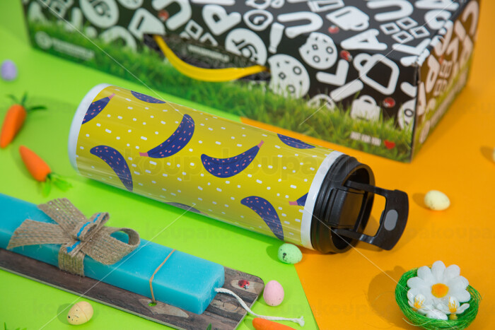Yellow seamless with blue bananas, Πασχαλινή Λαμπάδα με Travel Tumbler θερμό με διπλό καπάκι (600ml, BPA free) & κερί αρωματικό πλακέ (30cm) (ΤΙΡΚΟΥΑΖ)