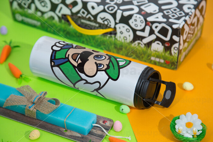 Super mario Luigi win, Πασχαλινή Λαμπάδα με Travel Tumbler θερμό με διπλό καπάκι (600ml, BPA free) & κερί αρωματικό πλακέ (30cm) (ΤΙΡΚΟΥΑΖ)