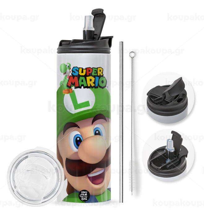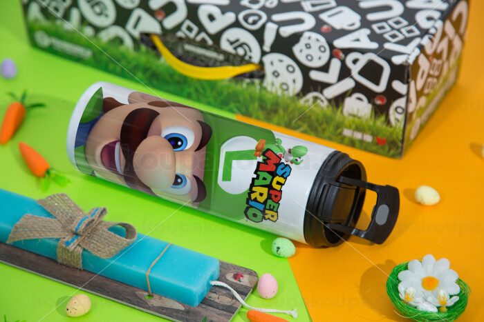 Super mario Luigi, Πασχαλινή Λαμπάδα με Travel Tumbler θερμό με διπλό καπάκι (600ml, BPA free) & κερί αρωματικό πλακέ (30cm) (ΤΙΡΚΟΥΑΖ)