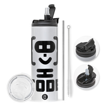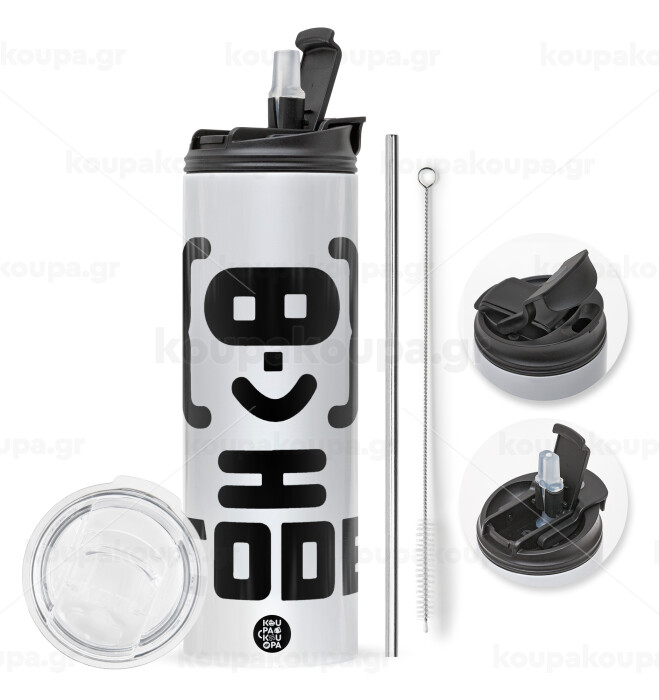 με 2 καπάκια για να επιλέξετε ανάμεσα σε απλό ποτήρι με καλαμάκι ή μετατροπή σε παγούρι θερμό με 2 τρόπους χρήσης (καλαμάκι ή στόμιο) με μεταλλικό επαναχρησιμοποιούμενο καλαμάκι. Απολαύστε το αγαπημένο σας ρόφημα κάθε στιγμή στο μοναδικό αυτό οικολογικό θερμό. Διατηρεί τη θερμοκρασία για αρκετές ώρες και είναι κατασκευασμένο από ανοξείδωτο ατσάλι. Κατάλληλο για ζεστά και κρύα ροφήματα. Συνοδεύεται από βουρτσάκι καθαρισμού για το καλαμάκι.