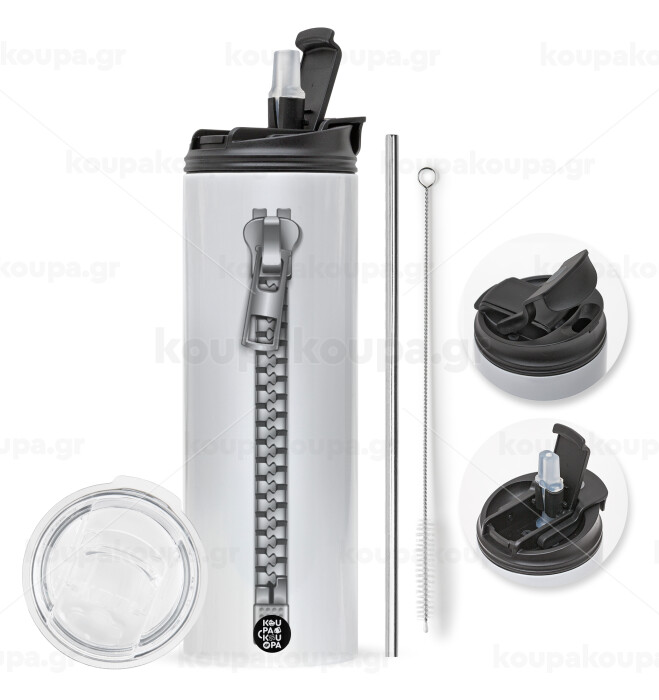 με 2 καπάκια για να επιλέξετε ανάμεσα σε απλό ποτήρι με καλαμάκι ή μετατροπή σε παγούρι θερμό με 2 τρόπους χρήσης (καλαμάκι ή στόμιο) με μεταλλικό επαναχρησιμοποιούμενο καλαμάκι. Απολαύστε το αγαπημένο σας ρόφημα κάθε στιγμή στο μοναδικό αυτό οικολογικό θερμό. Διατηρεί τη θερμοκρασία για αρκετές ώρες και είναι κατασκευασμένο από ανοξείδωτο ατσάλι. Κατάλληλο για ζεστά και κρύα ροφήματα. Συνοδεύεται από βουρτσάκι καθαρισμού για το καλαμάκι.