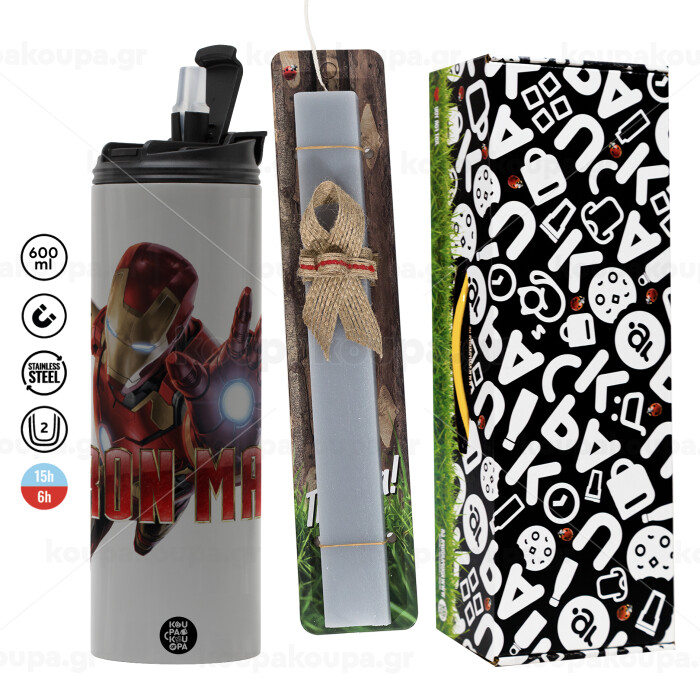 Ironman, Πασχαλινή Λαμπάδα με Travel Tumbler θερμό (600ml, BPA free) & κερί αρωματικό πλακέ (30cm) (ΓΚΡΙ)