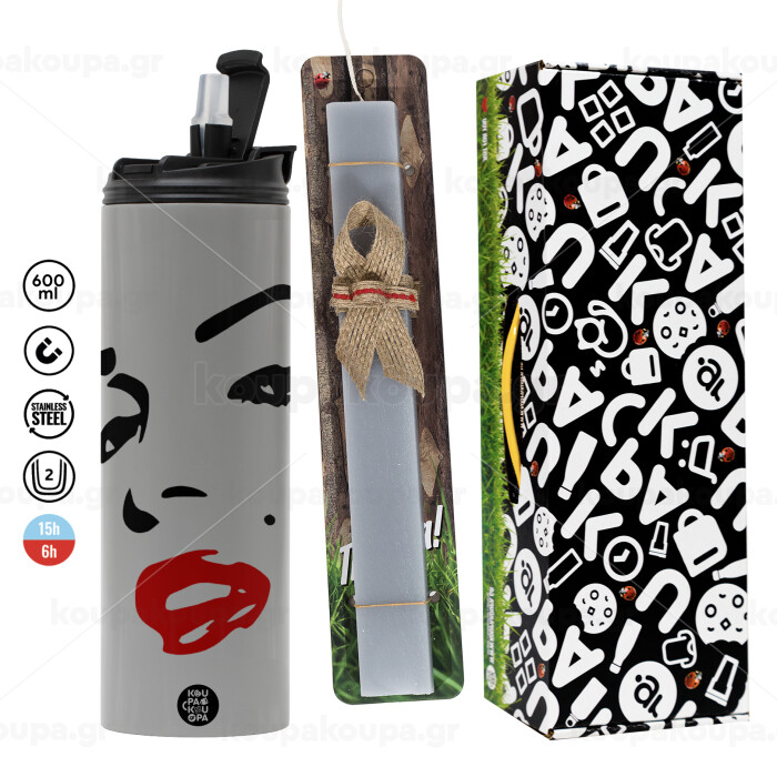 Marilyn Monroe, Πασχαλινή Λαμπάδα με Travel Tumbler θερμό (600ml, BPA free) & κερί αρωματικό πλακέ (30cm) (ΓΚΡΙ)