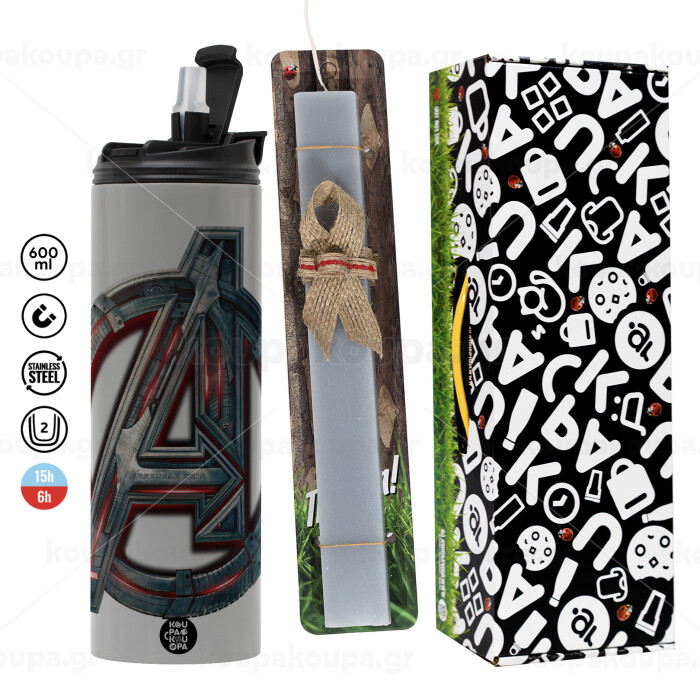 Avengers, Πασχαλινή Λαμπάδα με Travel Tumbler θερμό (600ml, BPA free) & κερί αρωματικό πλακέ (30cm) (ΓΚΡΙ)