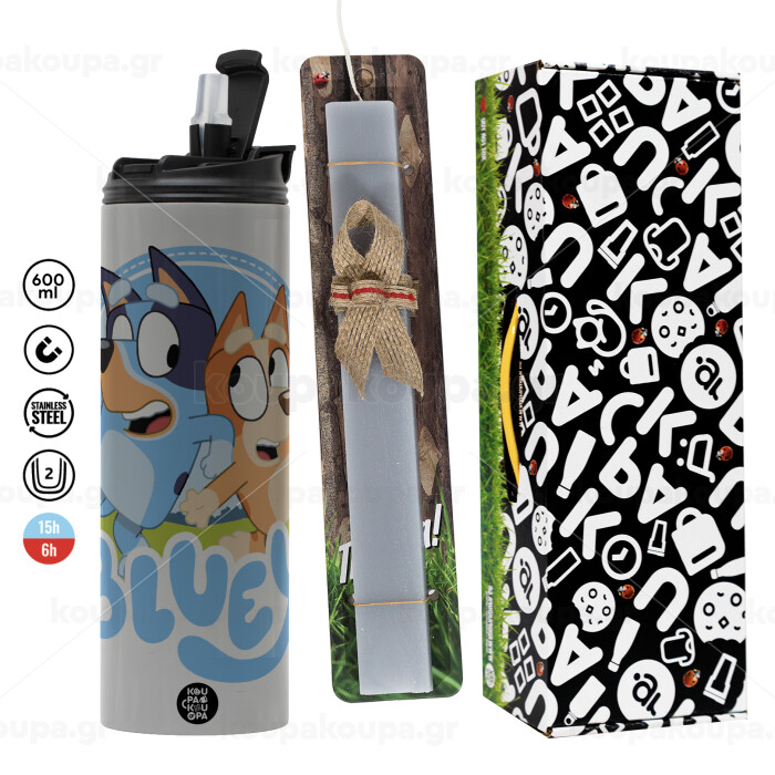 Μπλε, Πασχαλινή Λαμπάδα με Travel Tumbler θερμό (600ml, BPA free) & κερί αρωματικό πλακέ (30cm) (ΓΚΡΙ)