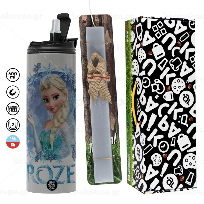 Frozen Elsa, Πασχαλινή Λαμπάδα με Travel Tumbler θερμό (600ml, BPA free) & κερί αρωματικό πλακέ (30cm) (ΓΚΡΙ)