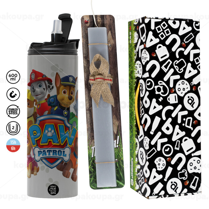 PAW patrol, τα κουτάβια, Πασχαλινή Λαμπάδα με Travel Tumbler θερμό (600ml, BPA free) & κερί αρωματικό πλακέ (30cm) (ΓΚΡΙ)