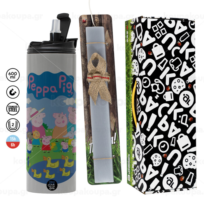 Peppa pig Family, Πασχαλινή Λαμπάδα με Travel Tumbler θερμό (600ml, BPA free) & κερί αρωματικό πλακέ (30cm) (ΓΚΡΙ)