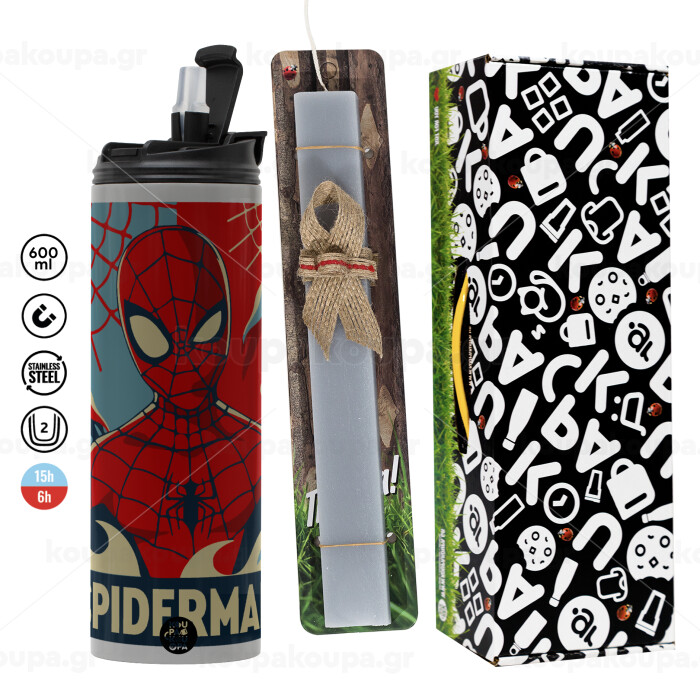 Spiderman kid, Πασχαλινή Λαμπάδα με Travel Tumbler θερμό (600ml, BPA free) & κερί αρωματικό πλακέ (30cm) (ΓΚΡΙ)
