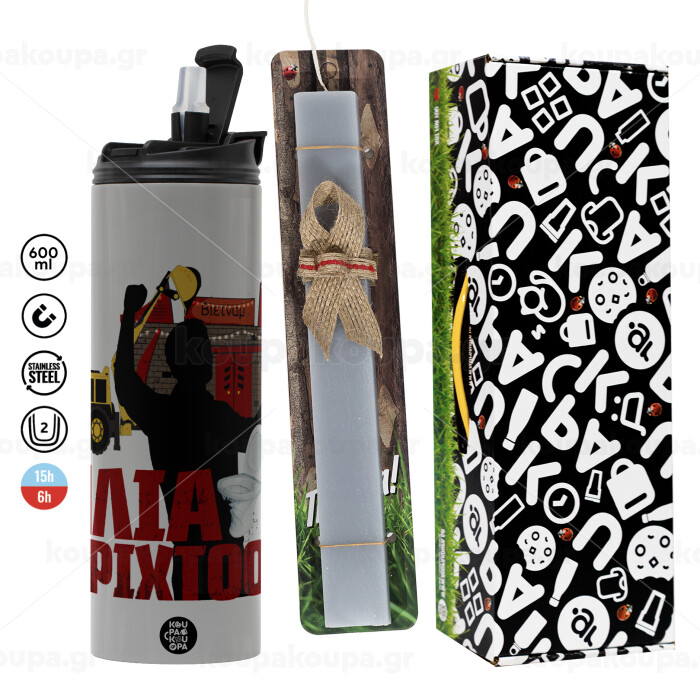 Ηλία ρίχτο!, Πασχαλινή Λαμπάδα με Travel Tumbler θερμό (600ml, BPA free) & κερί αρωματικό πλακέ (30cm) (ΓΚΡΙ)