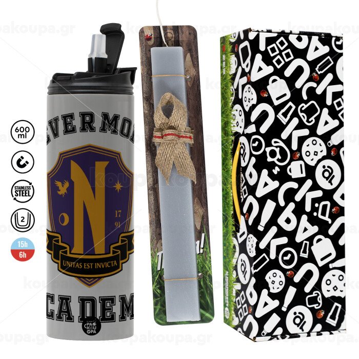 Wednesday Nevermore Academy University, Πασχαλινή Λαμπάδα με Travel Tumbler θερμό (600ml, BPA free) & κερί αρωματικό πλακέ (30cm) (ΓΚΡΙ)