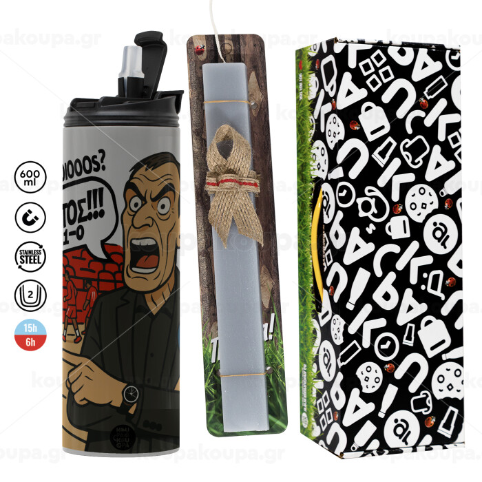 Μπαρτζό, Ποιος? Αυτός!!! 1-0, Πασχαλινή Λαμπάδα με Travel Tumbler θερμό (600ml, BPA free) & κερί αρωματικό πλακέ (30cm) (ΓΚΡΙ)