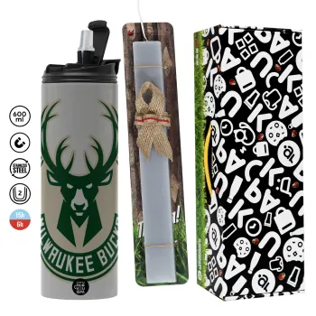 Milwaukee bucks, Πασχαλινή Λαμπάδα με Travel Tumbler θερμό (600ml, BPA free) & κερί αρωματικό πλακέ (30cm) (ΓΚΡΙ)