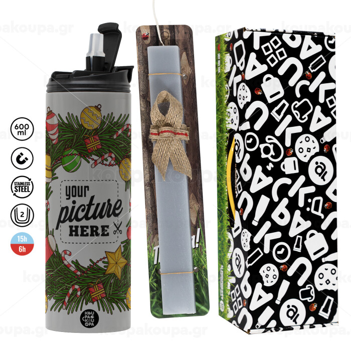 PHOTO Christmas twitch, Πασχαλινή Λαμπάδα με Travel Tumbler θερμό (600ml, BPA free) & κερί αρωματικό πλακέ (30cm) (ΓΚΡΙ)