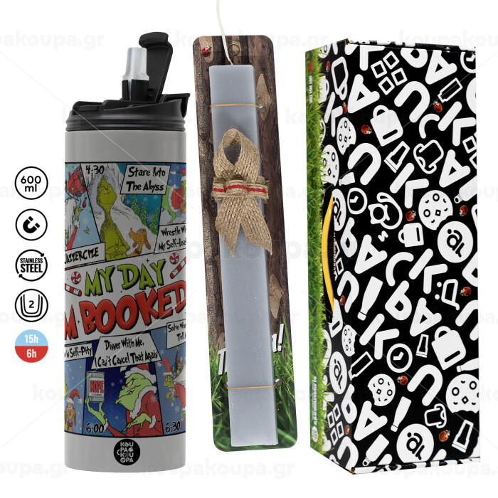 My Day Grinch, Πασχαλινή Λαμπάδα με Travel Tumbler θερμό (600ml, BPA free) & κερί αρωματικό πλακέ (30cm) (ΓΚΡΙ)
