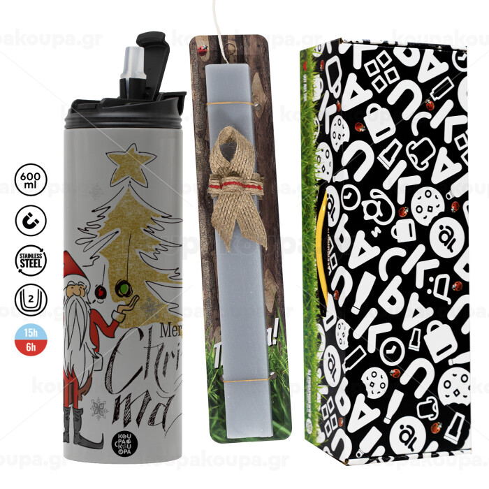 Santa Claus gold, Πασχαλινή Λαμπάδα με Travel Tumbler θερμό (600ml, BPA free) & κερί αρωματικό πλακέ (30cm) (ΓΚΡΙ)
