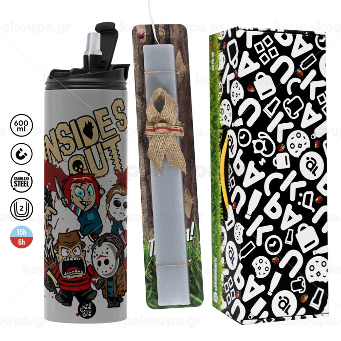 Halloween Inside out, Πασχαλινή Λαμπάδα με Travel Tumbler θερμό (600ml, BPA free) & κερί αρωματικό πλακέ (30cm) (ΓΚΡΙ)