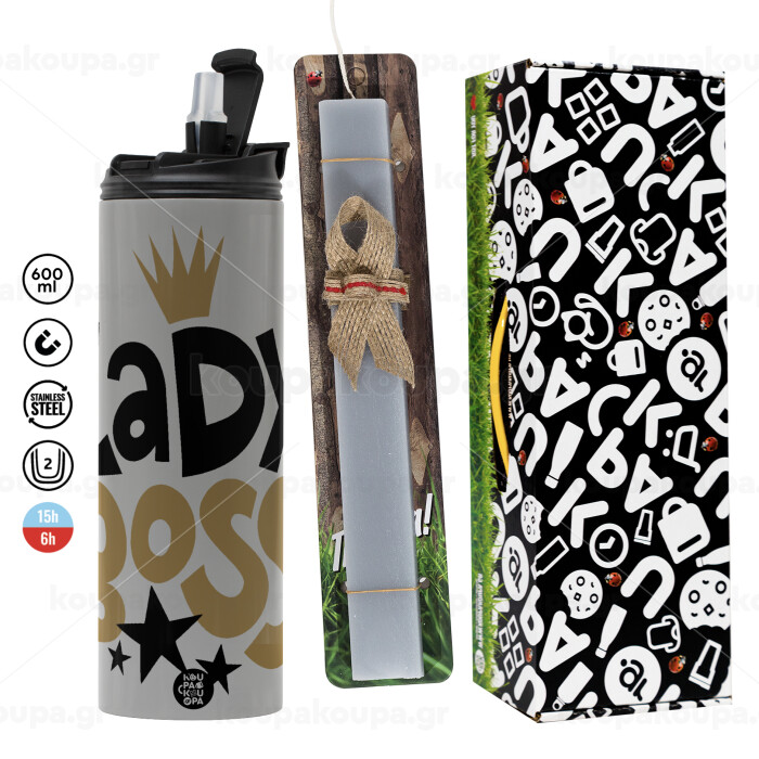 Lady Boss, Πασχαλινή Λαμπάδα με Travel Tumbler θερμό (600ml, BPA free) & κερί αρωματικό πλακέ (30cm) (ΓΚΡΙ)