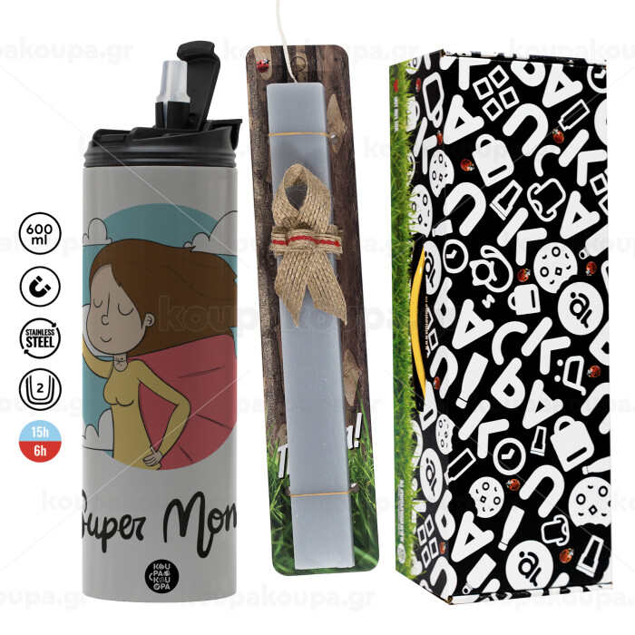 Super mom, Πασχαλινή Λαμπάδα με Travel Tumbler θερμό (600ml, BPA free) & κερί αρωματικό πλακέ (30cm) (ΓΚΡΙ)