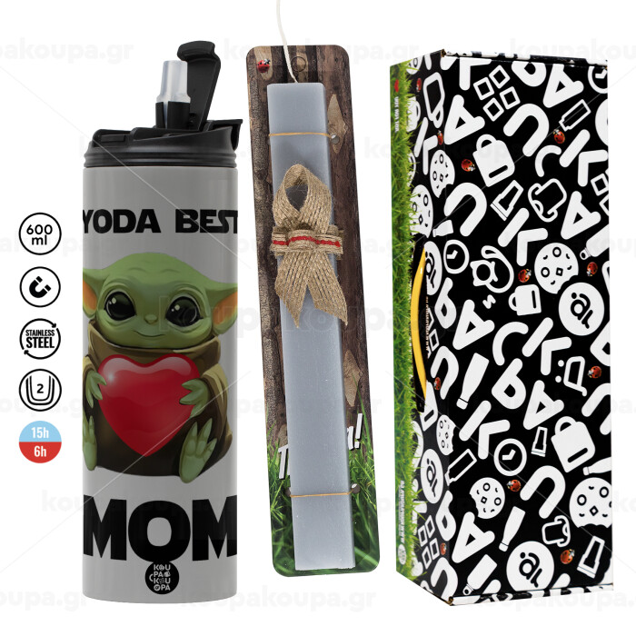 Yoda Best mom, Πασχαλινή Λαμπάδα με Travel Tumbler θερμό (600ml, BPA free) & κερί αρωματικό πλακέ (30cm) (ΓΚΡΙ)
