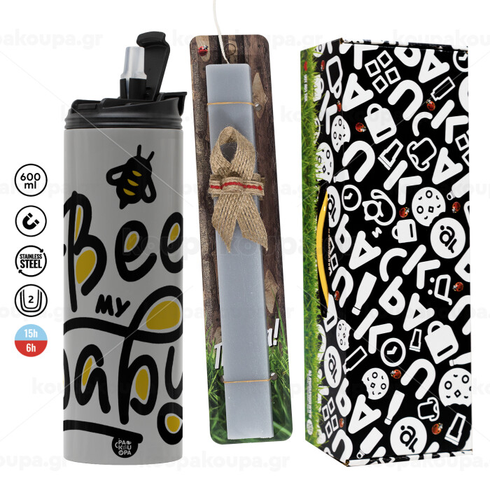 Bee my BABY!!!, Πασχαλινή Λαμπάδα με Travel Tumbler θερμό (600ml, BPA free) & κερί αρωματικό πλακέ (30cm) (ΓΚΡΙ)