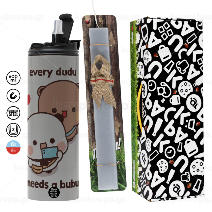 Every Dudu needs a bubu, Πασχαλινή Λαμπάδα με Travel Tumbler θερμό (600ml, BPA free) & κερί αρωματικό πλακέ (30cm) (ΓΚΡΙ)