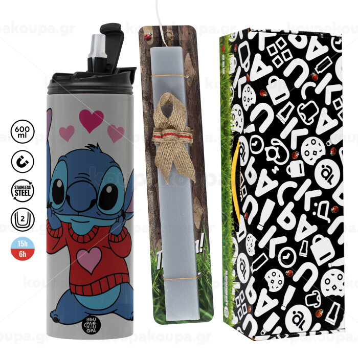 Stitch heart, Πασχαλινή Λαμπάδα με Travel Tumbler θερμό (600ml, BPA free) & κερί αρωματικό πλακέ (30cm) (ΓΚΡΙ)