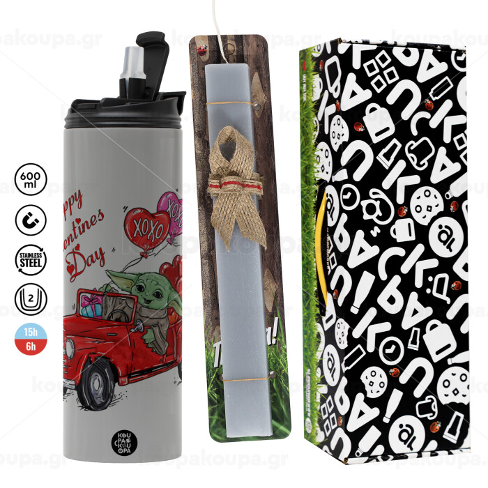 Yoda, happy valentines day (xoxo), Πασχαλινή Λαμπάδα με Travel Tumbler θερμό (600ml, BPA free) & κερί αρωματικό πλακέ (30cm) (ΓΚΡΙ)