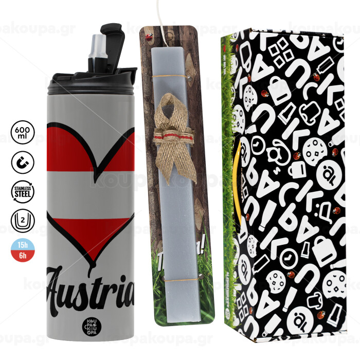 Austria flag, Πασχαλινή Λαμπάδα με Travel Tumbler θερμό (600ml, BPA free) & κερί αρωματικό πλακέ (30cm) (ΓΚΡΙ)