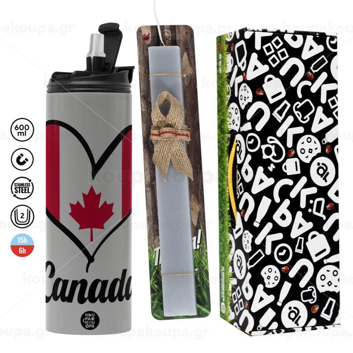 Canada flag, Πασχαλινή Λαμπάδα με Travel Tumbler θερμό (600ml, BPA free) & κερί αρωματικό πλακέ (30cm) (ΓΚΡΙ)