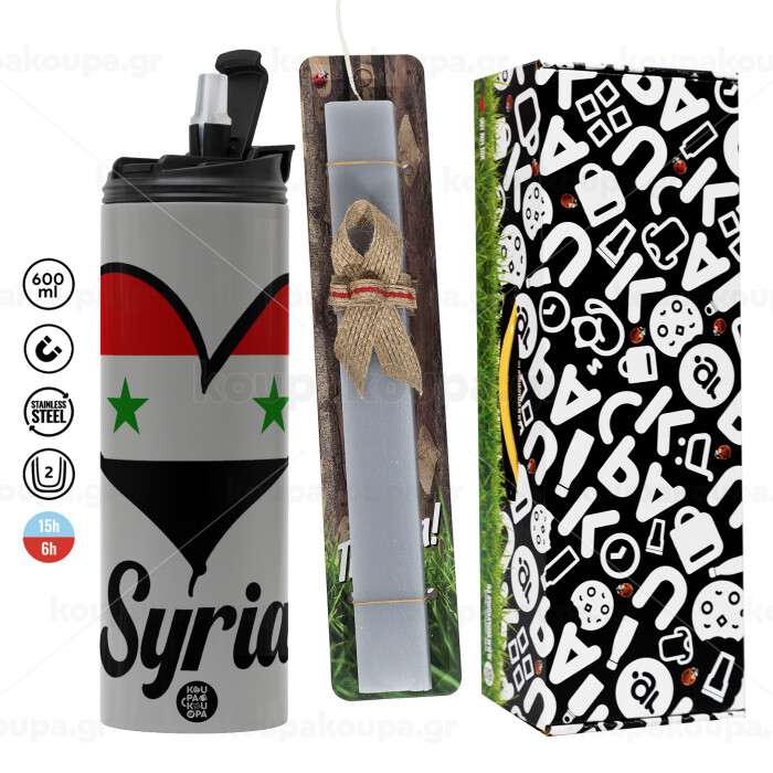 Syria flag, Πασχαλινή Λαμπάδα με Travel Tumbler θερμό (600ml, BPA free) & κερί αρωματικό πλακέ (30cm) (ΓΚΡΙ)
