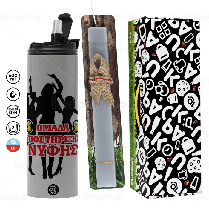 Bachelor Ομάδα υποστήριξης Νύφης, Πασχαλινή Λαμπάδα με Travel Tumbler θερμό (600ml, BPA free) & κερί αρωματικό πλακέ (30cm) (ΓΚΡΙ)