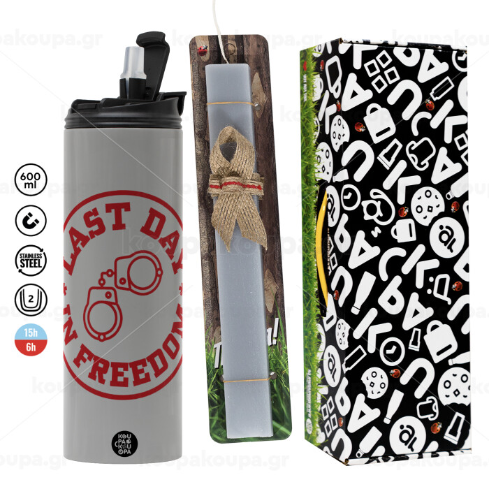 Last day freedom, Πασχαλινή Λαμπάδα με Travel Tumbler θερμό (600ml, BPA free) & κερί αρωματικό πλακέ (30cm) (ΓΚΡΙ)