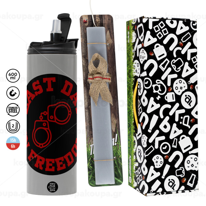 Last day in freedom, Πασχαλινή Λαμπάδα με Travel Tumbler θερμό (600ml, BPA free) & κερί αρωματικό πλακέ (30cm) (ΓΚΡΙ)