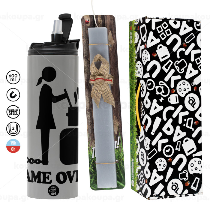 Woman Game Over, Πασχαλινή Λαμπάδα με Travel Tumbler θερμό (600ml, BPA free) & κερί αρωματικό πλακέ (30cm) (ΓΚΡΙ)
