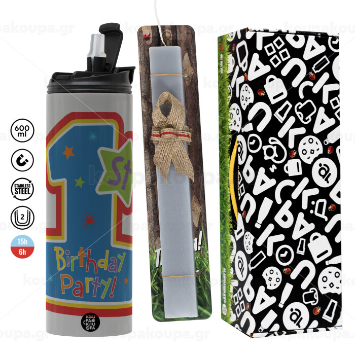 Happy 1st Birthday, Πασχαλινή Λαμπάδα με Travel Tumbler θερμό (600ml, BPA free) & κερί αρωματικό πλακέ (30cm) (ΓΚΡΙ)