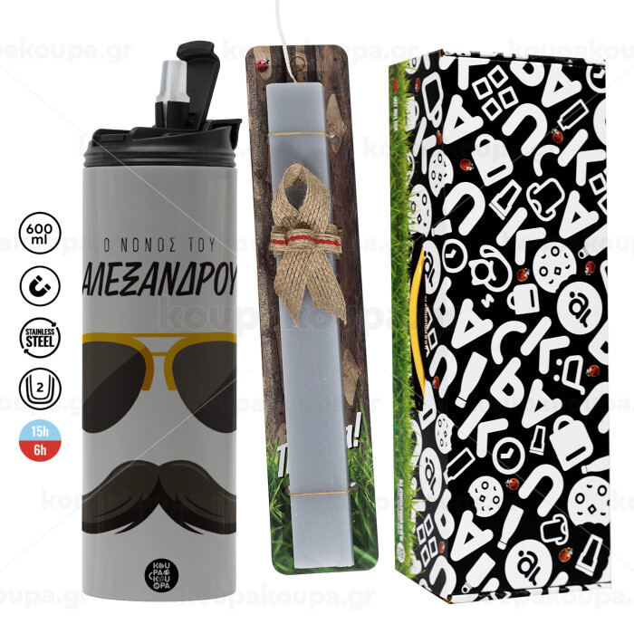 Ο νονός μου, μουστάκι με γυαλιά, Πασχαλινή Λαμπάδα με Travel Tumbler θερμό (600ml, BPA free) & κερί αρωματικό πλακέ (30cm) (ΓΚΡΙ)