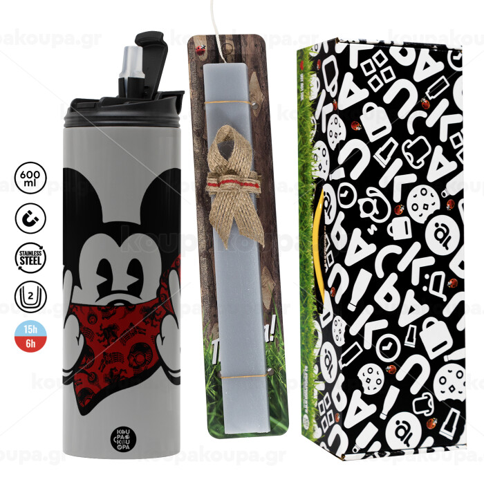 Mickey the fingers, Πασχαλινή Λαμπάδα με Travel Tumbler θερμό (600ml, BPA free) & κερί αρωματικό πλακέ (30cm) (ΓΚΡΙ)