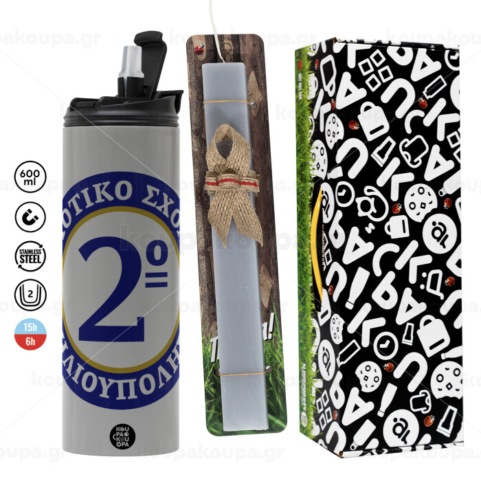 Έμβλημα Σχολικό μπλε/χρυσό, Πασχαλινή Λαμπάδα με Travel Tumbler θερμό (600ml, BPA free) & κερί αρωματικό πλακέ (30cm) (ΓΚΡΙ)
