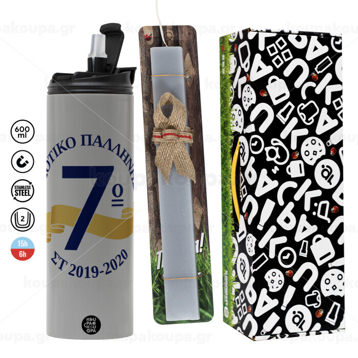 Σχολική μπλε με κορδέλα, Πασχαλινή Λαμπάδα με Travel Tumbler θερμό (600ml, BPA free) & κερί αρωματικό πλακέ (30cm) (ΓΚΡΙ)