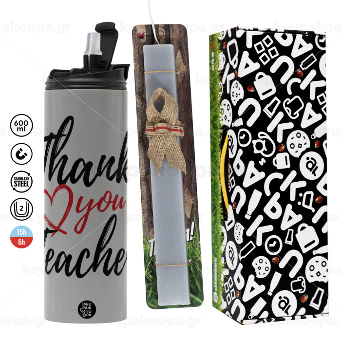 Thank you teacher, Πασχαλινή Λαμπάδα με Travel Tumbler θερμό (600ml, BPA free) & κερί αρωματικό πλακέ (30cm) (ΓΚΡΙ)