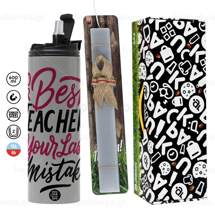 Typography quotes your best teacher is your last mistake, Πασχαλινή Λαμπάδα με Travel Tumbler θερμό (600ml, BPA free) & κερί αρωματικό πλακέ (30cm) (ΓΚΡΙ)