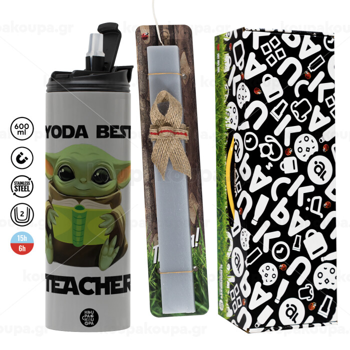 Yoda Best Teacher, Πασχαλινή Λαμπάδα με Travel Tumbler θερμό (600ml, BPA free) & κερί αρωματικό πλακέ (30cm) (ΓΚΡΙ)