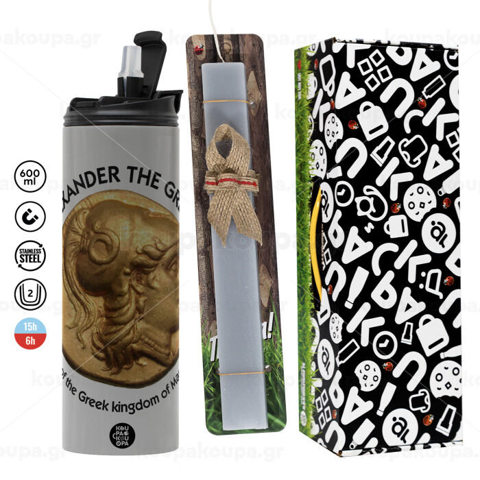 Alexander the Great, Πασχαλινή Λαμπάδα με Travel Tumbler θερμό (600ml, BPA free) & κερί αρωματικό πλακέ (30cm) (ΓΚΡΙ)
