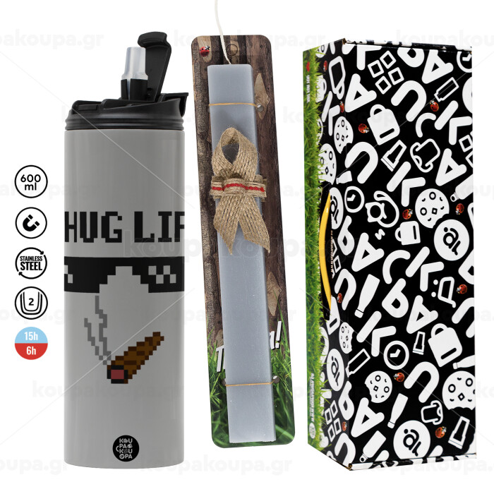 thug life, Πασχαλινή Λαμπάδα με Travel Tumbler θερμό (600ml, BPA free) & κερί αρωματικό πλακέ (30cm) (ΓΚΡΙ)