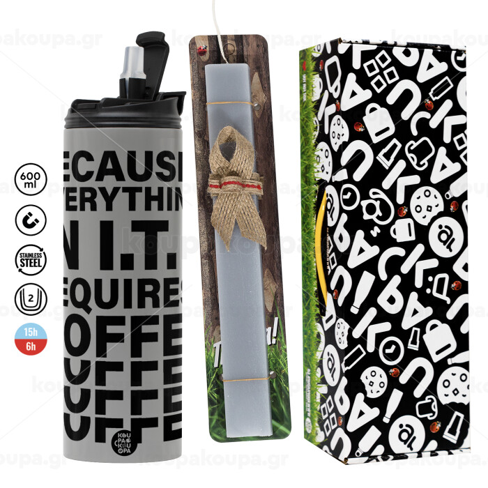 Because everything in I.T. requires coffee, Πασχαλινή Λαμπάδα με Travel Tumbler θερμό (600ml, BPA free) & κερί αρωματικό πλακέ (30cm) (ΓΚΡΙ)