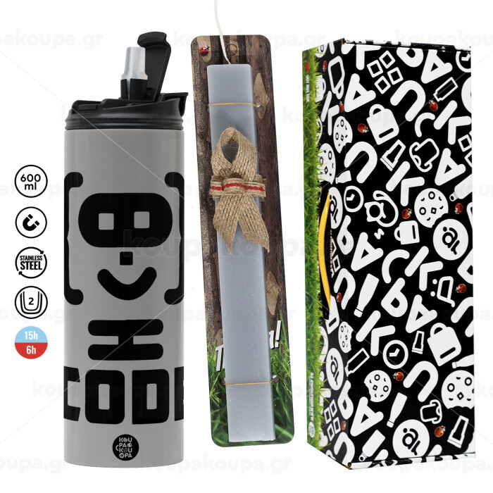 Code Heroes symbol, Πασχαλινή Λαμπάδα με Travel Tumbler θερμό (600ml, BPA free) & κερί αρωματικό πλακέ (30cm) (ΓΚΡΙ)